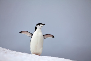 Montag, der 28. Januar 2013 Unsäglich langsam nur vermochte das menschliche Auge die Nebel des Eismeeres zu durchdringen; hinter der Nebelwand lag das Land des Mythos. Aus: 'In Nacht und Eis' (1898)Fridtjof Nansen Um 3 Uhr klingelt der Wecker. Auf der Außenkamera ist ein heller Streifen vor dunklem Himmel zu sehen und Sandra will es nun wissen. Oben an Deck angekommen, erweist sich die Kamera als sehr lichtempfindlich, denn eigentlich ist es draußen fast dunkel mit einem leicht helleren Horizont und es gießt in Strömen. Also schnell wieder ins Bett und beim zweiten Versuch um 6 Uhr ist es zwar heller aber sonst nicht viel besser. Wieder ein Tag ohne Anlandungen? Verzweiflung macht sich breit. Bereits um 7 Uhr wollen wir vor Half Moon Island liegen und die dortige Kolonie der Zügelpinguine besuchen, doch draußen ist es nass und grau. Die Wolken reichen fast hinunter bis zur Wasseroberfläche, die jedoch sehr glatt ist. Als tatsächlich der Startschuss für die Anlandung gegeben wird, machen wir uns auf eine Regenschlacht gefasst. Zum Glück sind wir erst als dritte Gruppe an der Reihe und haben so die Gelegenheit, uns alles genau anzusehen. Der Nebel wird immer dichter, es ist grau und ungemütlich. Wir packen alles wie geplant und dann geht es los. Im Grand Salon werden noch einmal unsere Jacken abgesaugt und dann steigen wir ins Zodiac. Das war einfach. Auch die Fahrt und die Anlandung sind sehr sanft. An Land werden wir bereits vom Expeditionsteam und den ersten Zügel-Pinguinen begrüßt. Uns wird gesagt, wo wir hindürfen und wohin nicht und dass wir ca. eine Stunde Zeit haben. Nach einigen Minuten wird es trockener von oben und wir können uns die Pinguine, ihre Jungen, Robben und einen Seebären in der Entfernung in aller Ruhe ansehen. Der Nebel lichtet sich etwas und wir können einige rote Hütten in der Entfernung erkennen. Ansonsten konzentrieren wir uns vollkommen auf die kleinen Gesellen, die mutig zwischen uns hindurch laufen. Ihre Jungen sind schon recht groß, werden jedoch immer noch gefüttert. |
