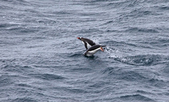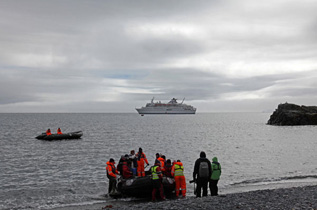 Die Stunde vergeht wie im Fluge und zurück an der Anlandestelle müssen auch hier noch ein paar Pinguine geknipst werden. Zwischen all den Zügel-Pinguinen steht ein einzelner Esels-Pinguin. Ob er ein Identitätsproblem hat??? Nach der Rückkehr zum Schiff und der damit verbundenen Reinigungsprozedur der Gummistiefel können wir beobachten, wie sich die Szenerie vollkommen verändert hat. Der Nebel hat sich gehoben und vor uns liegt nun eine grandiose Kulisse aus Gletschern und Bergen. Davor recht klein Half Moon Bay, wo immer noch die Passagiere umher spazieren. Die Gletscher reichen, soweit das Auge sehen kann, heute Morgen war uns dieser Anblick verwehrt. Als alle vier Landegruppen durch sind, gibt es für uns ein Mittag und die MS Delphin nimmt Kurs auf unser nächstes Ziel. Dabei macht sie Platz für die Sea Adventurer, die wohl heute Nachmittag in Half Moon Bay landen möchte. Unser nächstes Ziel heißt Deception Island und liegt nur 40 Seemeilen weiter südlich. Draußen ist es nun wieder sehr windig geworden, regnerisch und kalt. Wir wollen in der Kabine noch etwas packen, für den Fall, dass wir wirklich in die Caldera von Deception Island einfahren, die durch die Spitze eines aktiven Vulkans gebildet wird. Der bislang letzte Ausbruch fand im Jahre 1970 statt. Bei dem Wind glauben wir noch nicht so richtig daran. Dabei werden wir so müde, dass ein kurzer Mittagsschlaf eingelegt wird. |