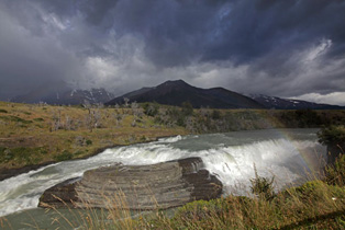 Dann fahren wir zur Cascada Paine, einem größeren Wasserfall. Auf dem Weg dorthin laufen uns ein paar Graufüchse über den Weg doch bevor wir sie fotografieren können, sind sie verschwunden. Am Wasserfall sind wir dann ganz allein und die Sonne kommt hervor wie für uns bestellt. Es ist herrlich, dem rauschenden türkisblauen Wasser zuzusehen. Sogar ein Regenbogen zeigt sich über dem Wasserfall. Wieder einmal genießen wir es, mit dem Auto unabhängig zu sein. Auf dem Weg zurück kreuzt plötzlich eine große Schafherde unseren Weg und wird sogleich als Fotomotiv erkannt. Mittlerweile ist es schon wieder so warm, dass man im T-Shirt draußen sein kann. Dann beginnen wir unseren weiteren Weg durch den Park und kommen nun in den westlichen Teil. Von hier sieht man die Torres überhaupt nicht mehr, dafür jedoch eine andere Formation, die man die Hörner nennt, Los Cuernos. Von verschiedenen Aussichtspunkten liegen sie zum Greifen nahe vor uns und ab und zu zeigt sich auch die Sonne. An einem weiteren Wasserfall, dem Salto Grande wollen wir uns schon einmal umsehen, denn hier möchte Sandra morgen zum Sonnenaufgang fotografieren. Da das Wetter ja heute doch ganz gut ist, gehen wir den halben Kilometer zu den Fällen sogar ohne Jacke. Hier sind bedeutend mehr Menschen unterwegs und auch wir schauen uns alles an. Man kann von hier aus sogar schon unser Hotel sehen und wir sind sehr gespannt, wie es denn wohl sein wird. Hier hatten wir vor zwei Jahren unsere Reservierung stornieren müssen wegen des Streiks und nun sind wir endlich doch da. Die Sonne scheint und der Lago Pehoe liegt strahlend türkisblau vor uns. Über eine lange rote Holzbrücke müssen wir gehen, um auf einer Insel das Hotel zu erreichen. |