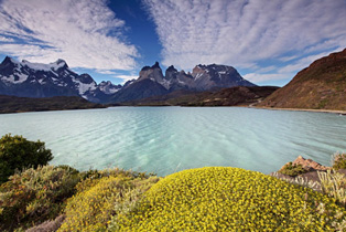 Es soll viele Reisende geben, denen es während ihres gesamten Aufenthaltes nicht vergönnt ist, die Spitzen des Bergmassivs überhaupt einmal zu sehen und uns gelingt das gleich im ersten Augenblick. Es ist wunderschön, im Sonnenschein auf diese Berge zu zufahren und als die Straße dem See einmal sehr nahe ist, halten wir an und gehen ans Ufer. Es ist völlig windstill und die Berge spiegeln sich im Wasser. Unglaublich, denn der Wind hier ist eigentlich legendär. Sandra befindet das Wasser für warm genug für ein Fußbad. Nach wenigen Sekunden im Wasser ändert sie ihre Meinung jedoch, oh was ist das kalt. Hier lassen wir uns Zeit. Am Ufer liegen ziemlich sonderbare Steine und die müssen wir uns genau ansehen. Die letzten 15 Kilometer bis zur Lodge fahren wir dann langsam, immer wieder die Ausblicke bewundernd. Die Lodge selbst scheint eher eine Estancia zu sein, die ein paar Zimmer vermietet aber uns ist es egal. Hier blühen überall Lupinen und als wir uns dem Haus nähern, kommt eine ältere Dame heraus, die sogar etwas Englisch spricht. Sie hat unsere Reservierung vorliegen und zeigt uns unser Zimmer im Nebenhaus. Während das Zimmer selbst recht einfach ist, ist der Blick aus dem Fenster unbezahlbar. Eigentlich bräuchten wir gar nicht mehr raus, denn das Paine Massiv liegt zum Greifen nahe direkt vor unserem Bett. Dann kommt noch eine jüngere Frau, die sehr gut Englisch spricht und von ihr erfahren wir, dass dies heute der erste windstille Tag des Sommers ist. |