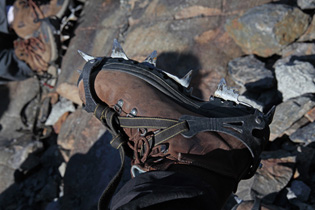 Dann endlich erreichen wir den Rand des Gletschers. Jeder bekommt Crampons in der passenden Größe und die Guides befestigen sie an unseren Füßen. Am Übergang von Fels zu Eis haben sich unter dem Eis kleine blauschimmernde Höhlen gebildet. Das sieht toll aus. Dann geht es los. Die ersten Schritte mit dem ungewohnten Fußwerk sind die schwierigsten, denn sie sind noch auf Stein. Nach ein paar Metern auf dem Eis erhalten wir eine genaue Einweisung, wie wir zu gehen haben. Breitbeinig, damit sich die Spikes nicht mit den Hosenbeinen verhaken, kurze feste Schritte, Gleichgewichtsverlagerung beim Bergauf- und bergabgehen. Gleich das erste Stück ist recht steil und wir alle müssen erst lernen, zu den Spikes das gleiche Zutrauen zu entwickeln wie für unsere Vibramsohlen auf Sandstein. Nein, wir rutschen nicht, die Spikes halten uns zuverlässig auch bei steileren Abschnitten. Während die erste Wegstrecke noch auf einer schmutzigen, fast schwarzen Gletscheroberfläche verläuft, wird die Umgebung immer heller. Kleine blaue Spalten sind zu sehen und die Sonne scheint wie verrückt. Nach der Enttäuschung mit Torres del Paine gestern ist nun schon alles halb so schlimm. Wir sind auf einem Gletscher. :-) Die Guides sind sehr aufmerksam und sichern uns an steileren Stücken gut ab. Es gibt viele Fotostopps und meine Kamera läuft heiß. Es ist wunderschön. Rund 90 Minuten verbringen wir hier im Eisskulpturenwunderland und zum Abschluss gibt es einen Baileys auf Gletschereis, bevor wir den Abstieg über Eis und Fels zum Boot beginnen. Nach einer Lunchpause im Sonnenschein wollen wir uns nun die Abbruchkante vom Wasser her genauer ansehen. Schon während unserer Wanderung hörten wir es mehrfach laut krachen und einmal flogen sogar Eisbrocken in hohem Bogen durch die Luft. Wir sind gespannt. Während die meisten Ausflügler erst einmal unter Deck gehen, um die Fotos der zur Tour gehörenden Fotografin anzusehen, bleiben wir mit einem amerikanischen Pärchen an Deck und erzählen ihnen gerade über die Naturschönheiten ihres Landes ;-) als es plötzlich wieder laut knallt. So schnell können wir gar nicht gucken, wie nun Eisberg für Eisberg von der schönen dunkelblauen rechten Seite des Gletschers mit hohen Wasserfontänen in den See stürzt. |